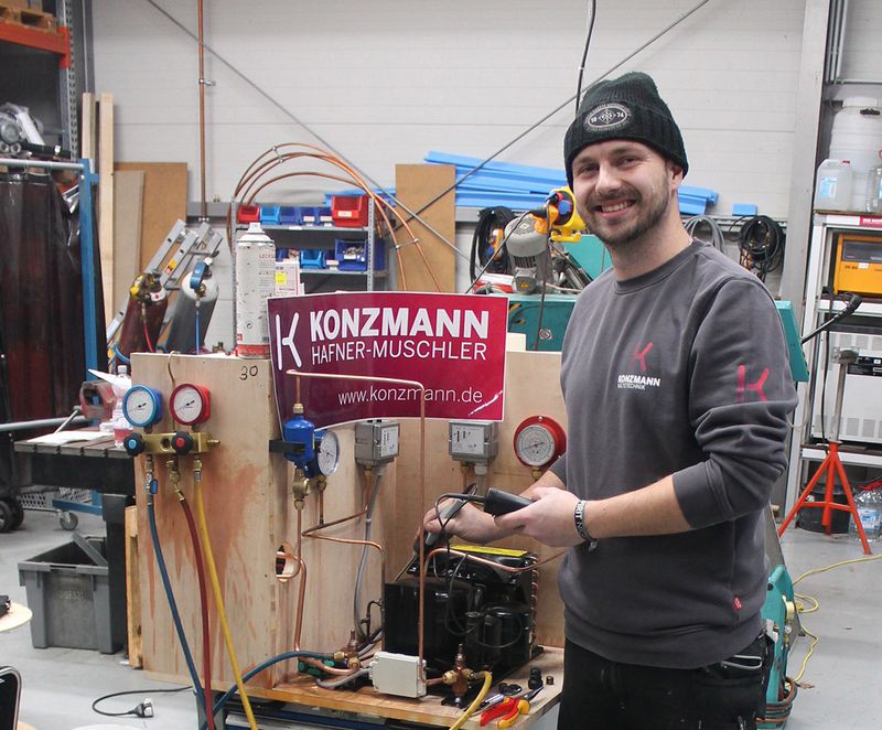 Nafz schätzt solche Herausforderungen. Das ist auch der Grund, warum er sich mit Mitte Zwanzig entschieden hat, nochmal eine Ausbildung zu beginnen. Denn nach dem Abschluss der Mittleren Reife hatte er zunächst Einzelhandelskaufmann gelernt. „Nach einigen Jahren wollte ich etwas Neues machen“, berichtet Nafz. Auf die Idee, sich näher mit Handwerk im Allgemeinen und mit anspruchsvoller Technik im Besonderen zu beschäftigen, brachte ihn sein Bruder, ebenfalls Mechatroniker für Kältetechnik bei Hafner-Muschler. Von ihm erhielt Nafz einen ersten Einblick in das Berufsfeld. Nach einem zweiwöchigen Praktikum stand seine Entscheidung fest. Was ihn besonders anspricht, formuliert er so: „Ich finde das Thema Kälte in Verbindung mit Elektronik und den sich schnell entwickelnden Steuerungsmöglichkeiten sehr interessant.“