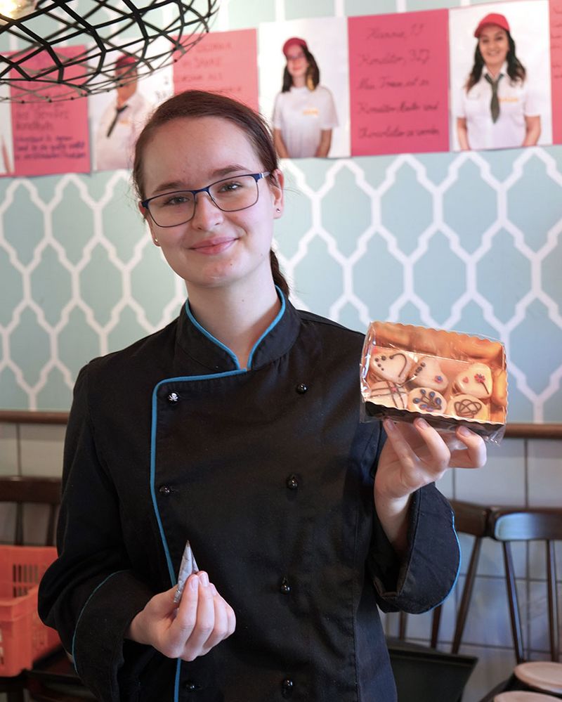 Was die Auszubildende an ihrem Arbeitsalltag schätzt, formuliert sie so: „Wir stellen hauptsächlich Kuchen und Torten her. Die Arbeit ist vielseitig. Eintönig wird es nie. Und ich kann immer wieder auch eigene Ideen einbringen.“ Das gilt besonders für Torten, die auf Kundenwunsch produziert werden und bei denen Kreativität gefragt ist. Schiebel liebt solche Herausforderungen. „Es ist einfach schön, mit seiner Arbeit anderen eine spezielle Freude bereiten zu können“, sagt Schiebel. Das mache sie stolz.
