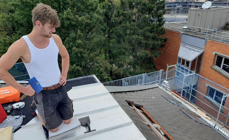 Auch dem Lehrling gefällt die Ausbildung: „Jeden Tag stehen wir vor herausfordernden, technisch anspruchsvollen und abwechslungsreichen Aufgaben und Arbeiten. Wir arbeiten an modernen Häusern, sind aber auch bei der Renovierung von denkmalgeschützten Gebäuden dabei. Durch die hochwertigen Arbeiten und wiederverwertbaren Materialien leisten wir einen Beitrag zum Umweltschutz, da wir Gebäude vor Verwitterung schützen und ihnen dadurch eine lange Lebensdauer geben.“ Und wenn es darum geht, Metalldächer oder Metallfassaden, Dachrinnen oder Regenfallrohre anzubringen, muss ein Spengler über Metalle, Kunststoffe und deren jeweiligen Verwendungszweckgenau im Bilde sein. Und auch Wissen über die entsprechenden Verbindungstechniken wie das Falzen, Nieten und Kleben braucht er. „Spaß an der Arbeit auf Baustellen, Schwindelfreiheit in luftiger Höhe an der frischen Luft, Lust auf Teamwork, Aufgeschlossenheit gegenüber Umweltschutzmaßnahmen sind Voraussetzungen für die Liebe an diesem Beruf“, sagt der 23-jährige Reutlinger, zu dessen aktuellen Aufgaben das Vorbereiten des Metalls nach Skizzen und Zeichnungen an der großen Biegemaschine und dem dazugehörigen Werkzeug ist.