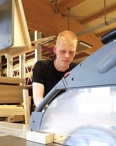Auf jeden Fall etwas Praktisches“ war Johannes Daikers Antwort auf die Frage, was er denn nach der Schule machen möchte. Realschule, dann zwei Jahre Technisches Gymnasium waren für ihn einfach genug der Theorie. Ein Praktikum in einer Schreinerei und ein Jahr Bundesfreiwilligendienst im Nationalpark Schwarzwald bekräftigten seine Entscheidung. „Der Werkstoff Holz ist äußerst interessant und vielfältig. Bereits vor meiner Ausbildung zum Schreiner, entdeckte ich in meiner Freizeit die Freude an der Arbeit mit Holz“, erzählt der 20jährige Auszubildende. „Ein paar kleinere Dinge aus Holz habe ich da schon gebaut und mich gefreut, wenn ich sah, wie beispielsweise aus ein paar Brettern ein funktionales Schränkchen wurde."