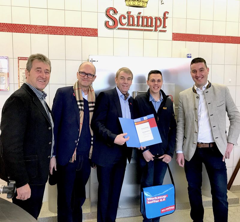 Braumeister und Seniorchef Alfred Schimpf, Hauptgeschäftsführer der Handwerkskammer Reutlingen, Dr. Joachim Eisert, Präsident der Handwerkskammer Reutlingen, Harald Herrmann, Lehrling Kevin Neuhoff und Braumeister und Juniorchef Martin Schimpf (v.l.n.r.). Foto: Florian Merkle