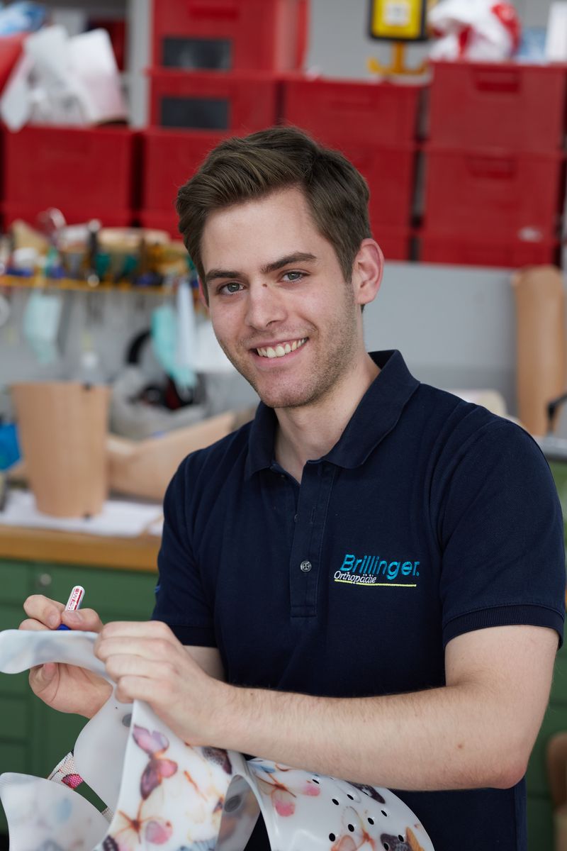 In seinem Job als Rettungssanitäter im FSJ kam Lukas Bader öfter mit Brillinger in Kontakt. Doch die Entscheidung, eine Ausbildung zum Orthopädietechnik-Mechaniker zu machen fiel erst auf der Berufsinfor-mationsmesse Binea in Reutlingen, als er am Stand des Orthopädietechnik-Unternehmens vorbeikam. „Die Mischung aus Handwerklichem und Medizinischem gefiel mir, also beschloss ich, mich dort zu bewerben“, so der Auszubildende. „Ein Glücksgriff im Nachhinein, denn hier stehe ich nicht nur an der Werkbank, sondern arbeite direkt mit und am Menschen. Diesen Kontakt habe ich als Sanitäter schon gemocht.“ Kein Tag gleicht in der Ausbildung dem anderen, aktuell arbeitet Lukas Bader in der Abteilung der Bandagisten und der Rumpforthetik – in diesem Bereich wird er auch seine Gesellenprüfung ablegen. Er hilft dort bei der Anfertigung und Fertigstellung von Korsetten, ist aber auch bei der Beratung und den Kundengesprächen mit dabei. Spaß macht ihm vor allem das Gestalterische. „Einen Bogen würde ich am liebsten um das Schleifen eines Sohlenausgleichs machen. Das finde ich nicht so prickelnd und habe überhaupt kein Händchen dafür“, so der 23-Jährige. Dabei stapelt er tief, denn seine Leistungen in der Schule sind in der Theorie und der Praxis erstklassig. Ausbilderin Michaela Baumann: „Wenn Lukas nächstes Jahr seine Prüfungen macht, dann bin ich sicher, dass er diese mit einer 1 vor dem Komma ablegt und einen sehr erfolgreichen Gesellenbrief vorweisen kann.“