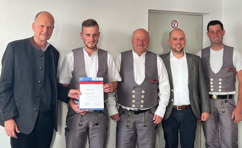 Hauptgeschäftsführer der Handwerkskammer Reutlingen, Dr. Joachim Eisert (1.v.li) bei der Übergabe der Urkunde an den Lehrling des Monats Manuel Harter (2.v.li) Foto: Handwerkskammer