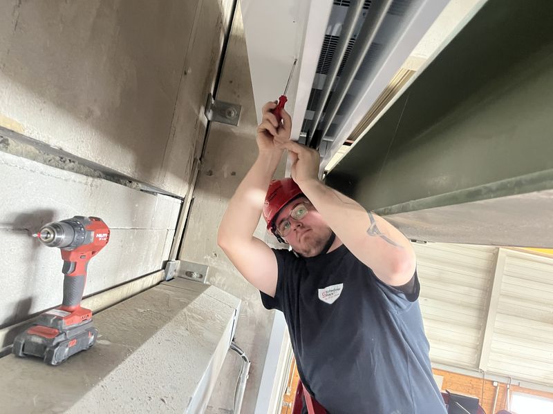 Moritz bei der Arbeit an einer Lüftungsanlage bei einem Rolltor in der Fertighausproduktionshalle bei Schwörer Haus. Foto: Schwörer Haus