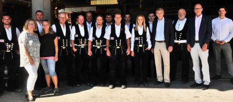 Die Belegschaft der Günter Holzbau GmbH mit den Gratulanten von der Handwerkskammer Reutlingen und der Kreishandwerkerschaft Freudenstadt.