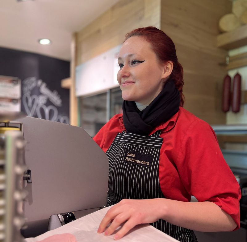 Länger auf eine Berufsausbildung verzichten wollte die junge Frau nicht. In den vergangenen Jahren hatte Rathmachers mit Gastronomie und Handel verschiedene Branchen kennengelernt, aber eben als Praktikantin oder Jobberin. Eine Freundin machte sie auf ihren heutigen Ausbildungsbetrieb aufmerksam. „Ich kannte die Albmetzgerei Steinhart bereits als Kundin. Ich hatte einen guten Eindruck und dachte, ich probiere es einfach mal“, berichtet Rathmachers. Sie bewarb sich lange nach dem regulären Beginn des Ausbildungsjahres. Das Bewerbungsgespräch hat sie in guter Erinnerung behalten, „offen und sympathisch“ sei es gewesen. Der Probearbeitstag sei indes „heftig“ gewesen, habe aber letztlich ihren Ehrgeiz geweckt: „Das will ich auch können, habe ich mir gesagt.“