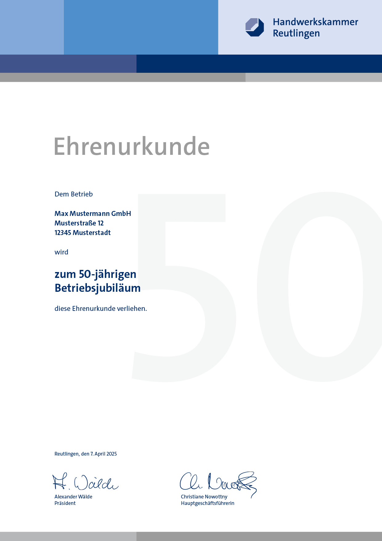 Handwerksbetriebe erhalten von der Handwerkskammer Reutlingen ein Schreiben, wenn sie nach dem in der Handwerksrolle eingetragenen Gründungsdatum ein Jubiläum haben müssten. Betriebe können – falls erforderlich und nachweisbar – dieses Datum korrigieren.