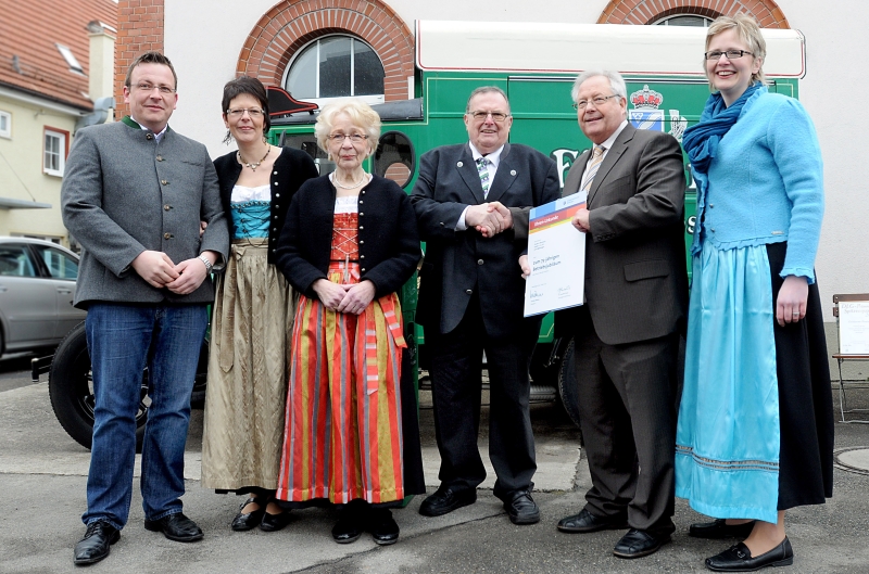 Glückwünsche von der Kammer: Tobias Fischer, Petra Ott-Fischer, Irmgard Fischer, Heinrich Fischer, Heinz Hammermeister, Geschäftsführer der Handwerkskammer Reutlingen, und Andrea Fischer-Ulbrich (v.l.n.r.) Foto: Rippmann