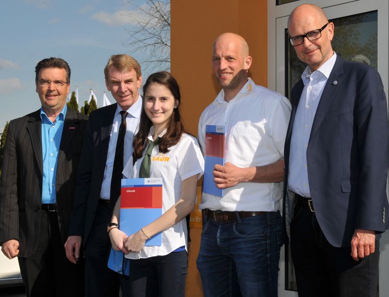 Harald Herrmann, Präsident der Handwerkskammer Reutlingen, und Hauptgeschäftsführer Dr. Joachim Eisert wiesen bei der Übergabe der Ehrenurkunde und eines Geldpräsents an Alina Frank darauf hin, dass der Betrieb immer ein gehöriges Stück zur guten Ausbildungsleistung mit beitrage. Seniorchef Hans-Peter Saur war viele Jahre Obermeister und auch im Berufsbildungsausschuss aktiv. Über 100 Lehrlinge wurden in seinen Betrieben bereits ausgebildet. Mit der Auszeichnung zum „Lehrling des Monats“, so Herrmann weiter, solle aber auch der Vorbildcharakter einiger Jugendlicher hervorgehoben werden. „Schön wäre es, wenn auf diesem Weg ein Ansporn für andere geschaffen werden könnte, eine Ausbildung im Handwerk zu beginnen.“