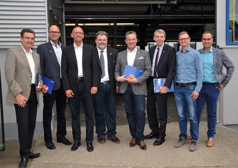 Handwerksvertreter zu Besuch bei der Lacker AG: Siegfried Dreger, Kreishandwerkerschaft, Dr. Joachim Eisert, Hauptgeschäftsführer der Handwerkskammer, Vorstand Frank Lacker, Manfred Haug, Vorstand der Handwerkskammer, Kreishandwerksmeister Alexander Wälde, Kammerpräsident Harald Herrmann, Thorsten Zukschwerdt, Kaufmännischer Leiter, und Betriebsleiter Stefan Störzer.