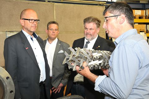 Geschäftsführer Martin Schwarz erklärt die Konstruktion und Funktionsweise eines Werkstücks.