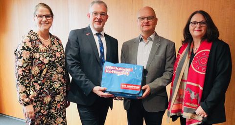 Feierliche Vereidigung in der Handwerkskammer. Susanne Hammann, Geschäftsbereichsleiterin Berufsausbildung, Prüfungs- und Sachverständigenwesen, Präsident Alexander Wälde, Andreas Burandt und Hauptgeschäftsführerin Christiane Nowottny. Foto: Handwerkskammer