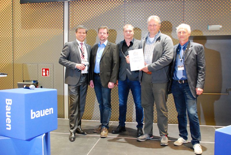 Bei der Preisverleihung des Sonderpreises „Nachwuchsmarketing“ (v.li.n.re.): Rainer König (Vorsitzender des Bundesverband Ausbau und Fassade BAF), Stefan Hüttl (Kaufmännischer Leiter), Alexander Kern (Stuckateurmeister), Roman Geiselhart (Geschäftsführer) und Dr. Roland Falk (Jurymitglied und Leiter des Kompetenzzentrum Ausbau und Fassade).