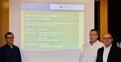 Peter Pfeiffer und Joachim Luft von der Luft Engineering GmbH sowie Dirk Högle von der Streit Datentechnik GmbH stellten Apps für Smartphones, Tablets und Laptops vor. Damit kann der bisherige Rapportzettel für Arbeitsleistungen auf Baustellen abgelöst werden. Die neue Technik bietet viele Vorteile. So können die Daten sowohl in der Buchhaltung als auch für die Projektsteuerung genutzt werden.