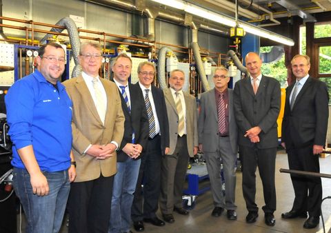 Werkstattleiter Norwin Mößmer, Präsident Joachim Möhrle, Clemens Riegler, Leiter der Bildungsakademie Tübingen, Günter Hanninger, Fachverband SHK Baden-Württemberg, Präsident Franz Klumpp, Vizepräsident Wolfgang Friedrich, Hauptgeschäftsführer Dr. Joachim Eisert und Dr. Hans-Balthas Klein, Hauptgeschäftsführer des SHK-Verbandes (v.l.n.r).