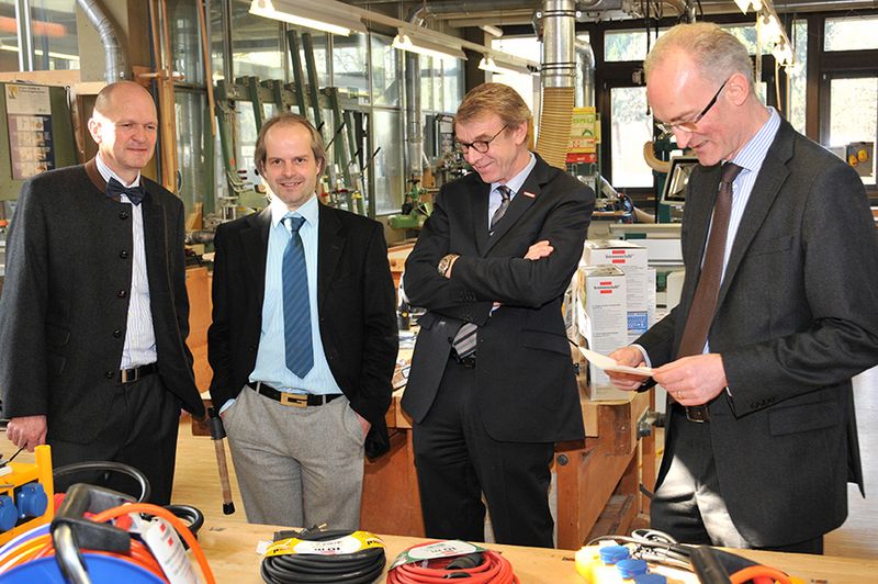 Kabeltrommeln, Steckdosenleisten und Leuchten für die Ausbildungswerkstätten: Hauptgeschäftsführer Dr. Joachim Eisert, Sebastian Brennenstuhl, Geschäftsführer der Hugo Brennenstuhl GmbH & Co. KG, Präsident Harald Herrmann und Brennenstuhl-Marketingleiter Jens Bleckmann (v.l.n.r.).