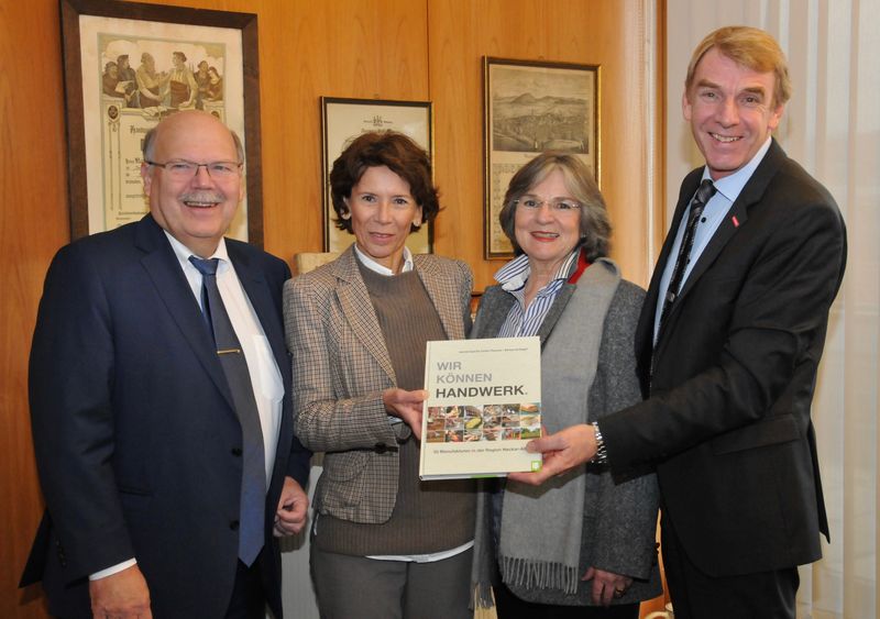 (v.li.n.r) Die beiden Autorinnen Bärbel Schlegel und Astrid-Camilla Feifel-Thomas bei der Buchpräsentation mit dem Verleger Valdo Lehari jr. und Handwerkskammerpräsident Harald Herrmann.