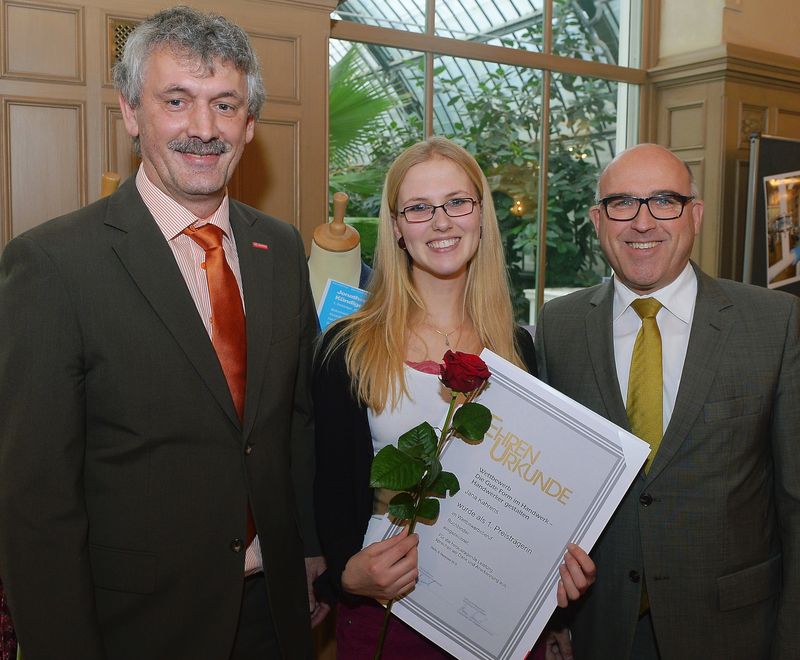 Karl-Heinz Goller, Leiter der Ausbildungsabteilung der Handwerkskammer Reutlingen, die Buchbinderin Jana Kahrens und der stellvertretende Hauptgeschäftsführer Rainer Neth (v.li.n.re.).
