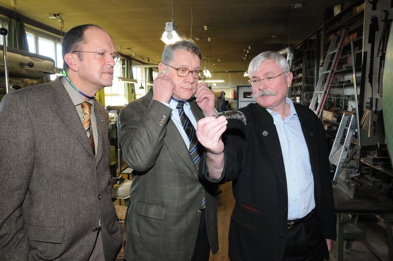 Exportschlager aus Reutlingen: Sieghard Schwille (rechts) erklärt Präsident Joachim Möhrle (Mitte) und Hauptgeschäftsführer Joachim Eisert (links), was ein gutes Gartenmesser ausmacht.