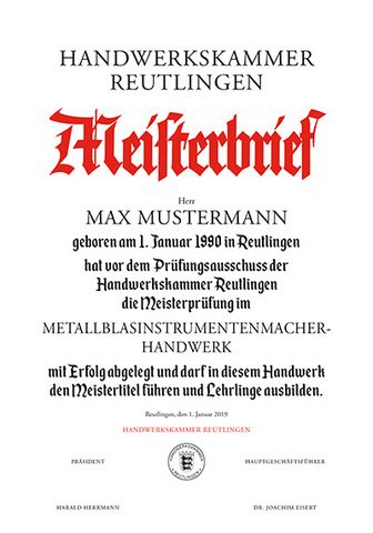 Auf vielfachen Wunsch kann nun ab sofort neben dem aktuellen aufwändig mit Prägedruck und Silberfolie versehenen Meisterbrief auch ein historischer Meisterbrief in traditionellem Design gebührenpflichtig gemäß der Gebührenordnung der Handwerkskammer für 25,00 Euro ausgestellt werden.