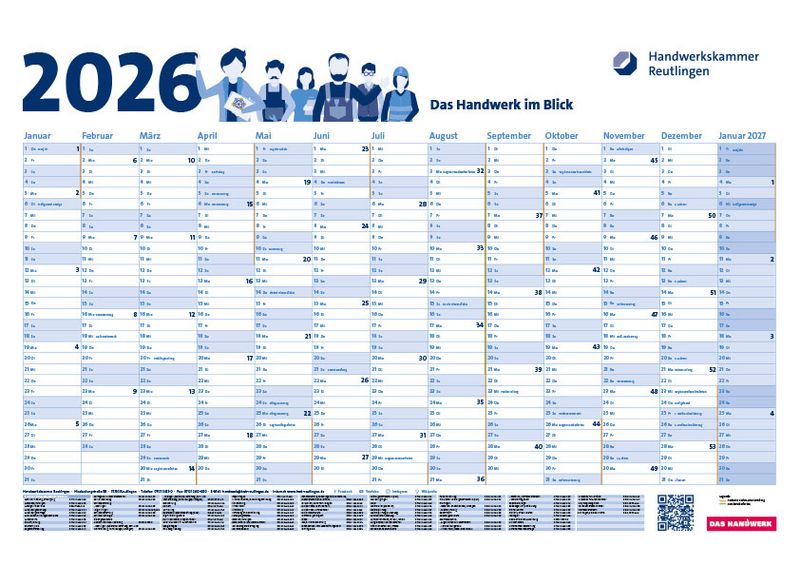 Viele Mitgliedsbetriebe schätzen den praktischen Wandkalender der Handwerkskammer. Neben der gedruckten Version bieten wir den Kalender auch gerne zum Download an.