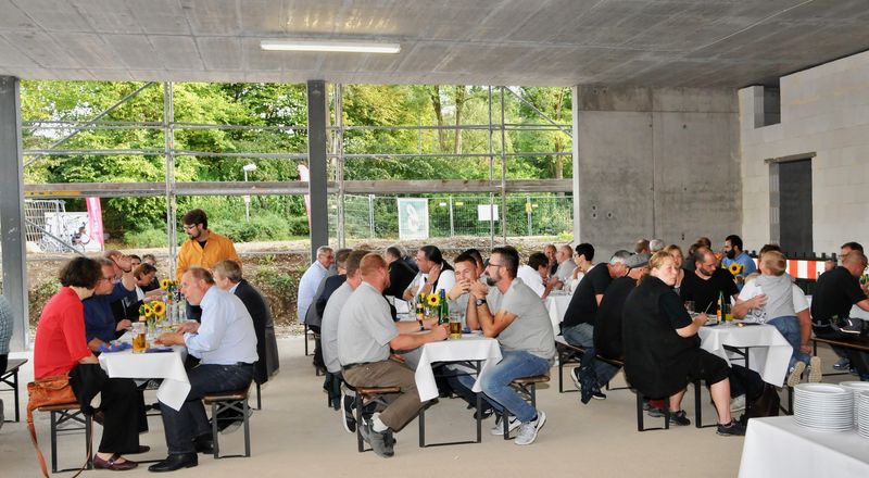 Zuletzt konnte unter den Augen der zahlreich erschienenen Gästen – an die 70 Personen nahmen am Festakt teil – der feierliche Richtspruch gesprochen werden. Dieser oblag dem Polier Markus Buck von der Straßen- und Ingenieurbau Gottlob Brodbeck GmbH & Co. KG. in Metzingen. Das obligatorische Glas Wein, das er am Ende des Richtspruchs auf den Boden warf, zerschellte, was, wie man sagt, ein gutes Zeichen ist und Glück und Segen für den Bau bringen soll.