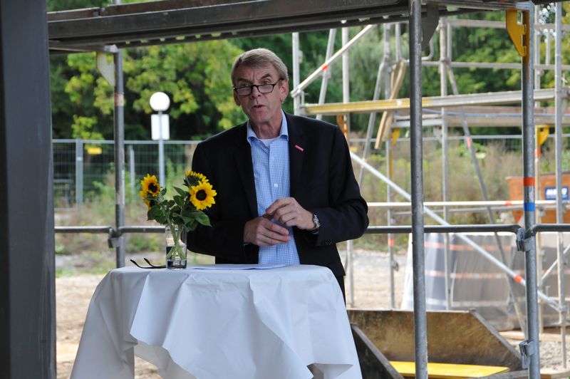 „Die größte Herausforderung bestand und besteht darin, die diversen Arbeiten so zu koordinieren, dass der Umbau während des täglichen Schulbetriebs termingerecht vollzogen werden kann“, sagte Harald Herrmann, Präsident der Handwerkskammer Reutlingen, bei seiner Begrüßungsrede. Derzeit werden mehrere Werkstätten und Sanitärräume modernisiert und nach den aktuellen Richtlinien umgebaut. Im Internatsgebäude werden sich in Erdgeschoss die Kantine, Büroräume und ein Sportraum befinden; 53 Übernachtungsmöglichkeiten in 32 Zimmern sollen in den beiden Stockwerken darüber entstehen. Des Weiteren dankte Herrmann allen am Bau Beteiligten, allen voran den Handwerkern der verschiedenen Gewerke, den Planern, den Architekten und Bauleitern. Auch den Mitarbeitern der Bildungsakademie dankte er für ihre Geduld, Ausdauer und ihr Verständnis, die tägliche Arbeit unter dem Baulärm absolvieren zu müssen.