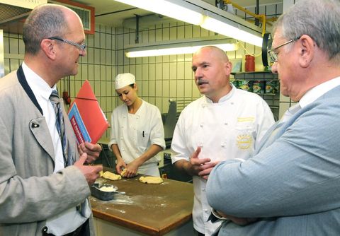 Reutlinger Spezialitäten: Konditormeister Andreas Sommer erklärt Kammerpräsident Joachim Möhrle und Hauptgeschäftsführer Dr. Joachim Eisert einzelne Produktionsabläufe.