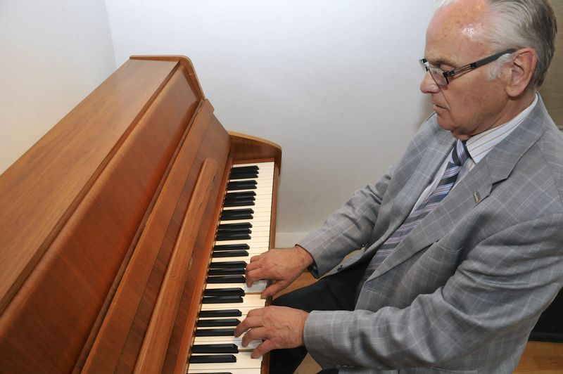 Jörg Ruoss an seinem als Meisterstück gebauten Klavier, das inzwischen immer noch von Schülern zum Üben genutzt wird.