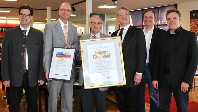 Überreicht wurde außerdem der Goldene Meisterbrief und gratuliert werden konnte darüber hinaus auch noch zu 80 Jahren Musikhaus Rudert. Hier ist der 1939 geborene Jubilar immer noch Gesellschafter, nachdem er bereits 1971 Geschäftsführer in diesem Geschäft seines Schwiegervaters wurde.