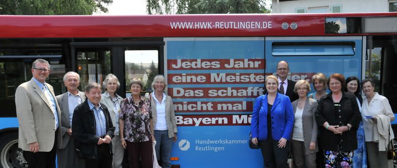 Die Mitglieder der Frauen Union Kreisverband Reutlingen und des Arbeitskreises Bildung des CDU-Kreisverbandes Reutlingen gemeinsam mit dem CDU-Bundestagskandidaten für Reutlingen, Michael Donth (links), und Hauptgeschäftsführer Dr. Joachim Eisert (6. von rechts) vor dem Imagekampagnenbus der Handwerkskammer.