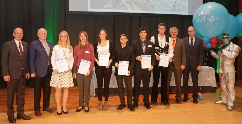 Landeshandwerkspräsident Rainer Reichhold, Joachim Wohlfeil (Präsident der Handwerkskammer Karlsruhe), die Buchbinderin Jana Kahrens, die Raumausstatterin Rita Irßlinger, die Sattlerin Sina Fath, der Systemelektroniker Patrick Hohbach, der Technischer Modellbauer Fabian Baumgärtner, der Zimmerer Marcel Renz, Karl-Heinz Goller (Leiter der Ausbildungsabteilung der Handwerkskammer Reutlingen) und Dr. Joachim Eisert (Hauptgeschäftsführer der Handwerkskammer Reutlingen) (v.li.n.re.).