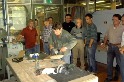 Die 15 Teilnehmer erwartete ein vielseitiges Programm. Sebastian Heinzelmann von der Firma Zweihorn stellte am ersten Tag die neuesten Entwicklungen bei Wasserlacken vor. Im Mittelpunkt seines Beitrages standen chemische Zusammensetzungen, Mischverhältnisse und der optimale Einsatzbereich der Lacke. Natürlich kam auch die Praxis nicht zu kurz. Die Teilnehmer testeten die neuen Wasserlacke an verschiedenen Werkstücken.