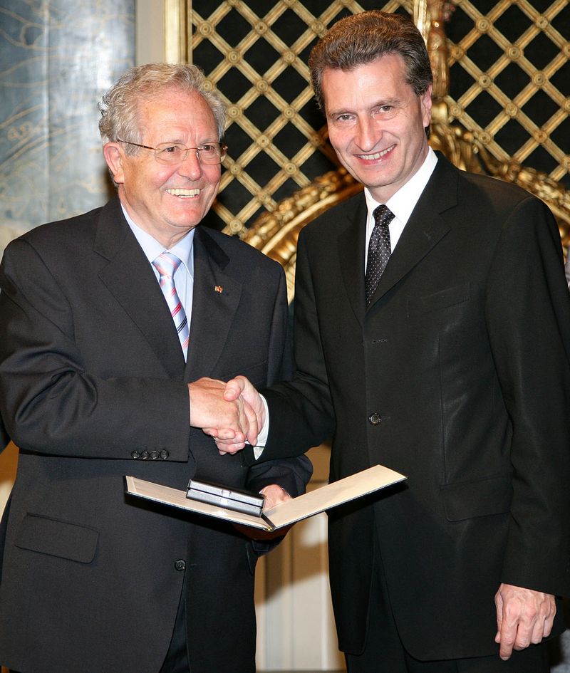Ministerpräsident Günther Oettinger (rechtst) gratuliert Günther Hecht zur Verdienstmedaille des Landes.
