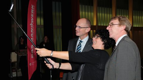 Alle Kammer-, Landes- und Bundessieger sind aufgefordert, Selfies von sich einzusenden. Dieses hier zeigt Hauptgeschäftsführer Dr. Joachim Eisert, Moderatorin Steffi Renz und Präsident Harald Herrmann bei der Abschlussfeier in Gomaringen. Der Selfie-Stick auf dem Bild ist zu gewinnen.