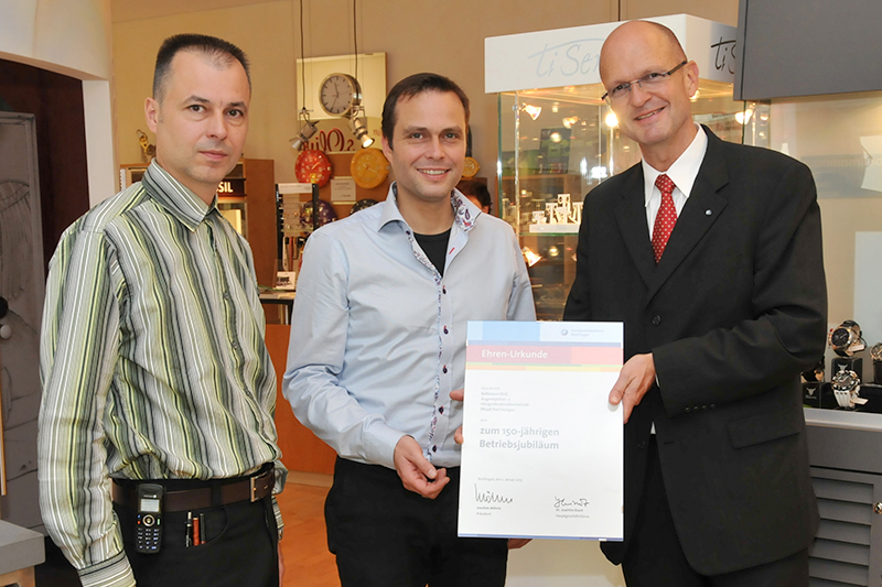 Von der Handwerkskammer gab es eine Ehrenurkunde: Stefan und Gerald Bollmann und Dr. Joachim Eisert, Hauptgeschäftsführer der Handwerkskammer Reutlingen (v.l.n.r.).