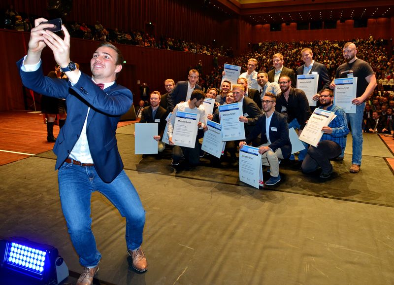 Präsident Herrmann, Vizepräsident August Wannenmacher, Hauptgeschäftsführer Dr. Joachim Eisert und der stellvertretende Hauptgeschäftsführer Rainer Neth werden den Jungmeisterinnen und Jungmeistern aus 13 Gewerken auf der Bühne die Meisterbriefe überreichen.