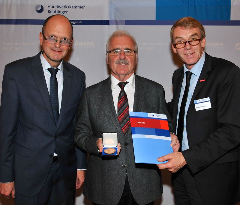 Hauptgeschäftsführer Dr. Joachim Eisert, Karl Wagner und Präsident Harald Herrmann bei der Verleihung der Alfred-Geisel-Medaille bei der Vollversammlung der Handwerkskammer Reutlingen (v.l.n.r.).