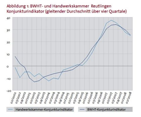Die Frühjahrsbelebung brachte keinen Umschwung: Die Geschäftslage der Handwerksbetriebe im Bezirk der Handwerkskammer Reutlingen hat sich merklich abgeschwächt. Der Konjunkturindikator, der die wichtigsten Kennzahlen und die Erwartungen der Unternehmen abbildet, liegt auch im zweiten Quartal 2008 deutlich unter den Vorjahreswerten.