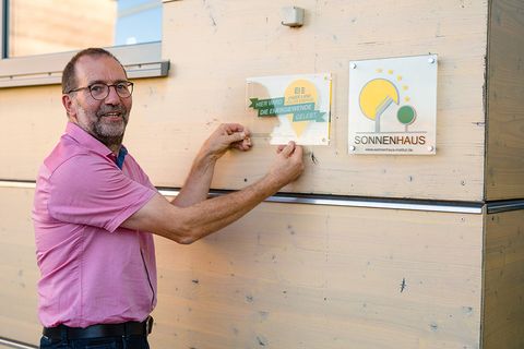 Geschäftsführer Thomas Hartmann mit seiner Plakette „Unser Land. Voller Energie“.