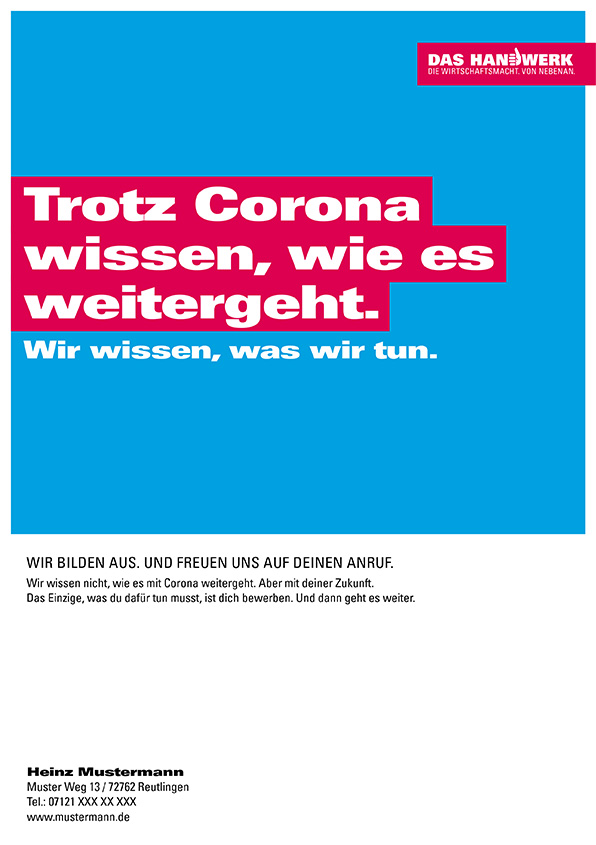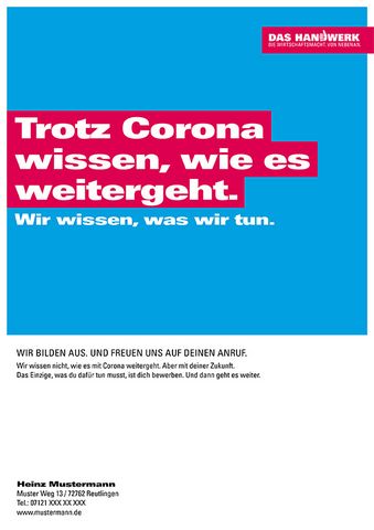 Im Werbemittelportal der Imagekampagne können sechs individualisierbare Ausbildungsmotive für Plakate und Social Media heruntergeladen werden. Slogans wie „Starten statt warten: Wir bilden weiter aus.“, „Was man dieses Jahr bloß anfangen soll? Eine Ausbildung.“ oder „Trotz Social Distance: Wir sollten uns näher kennenlernen.“ informieren in jugendlicher Ansprache über offene Ausbildungsstellen.