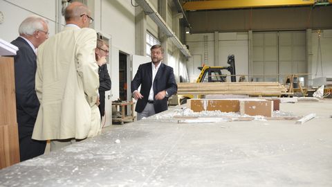 Eine der Stationen des Besuchstages war das Bauunternehmen Georg Reisch GmbH & Co. KG in Bad Saulgau. Geschäftsführer Hans-Georg Reisch erklärte Harald Herrmann, Präsident der Handwerkskammer, Karl Griener, Geschäftsführer der Kreishandwerkerschaft Sigmaringen und Kreishandwerksmeister Siegmund Bauknecht (von rechts nach links), worauf es bei der Fertigung von Betonteilen ankommt.