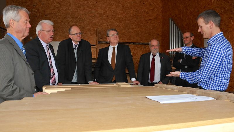 Handwerkskammer-Vorstandsmitglied Hermann Pfaff, Kreishandwerksmeister Siegmund Bauknecht, Handwerkskammer-Hauptgeschäftsführer Dr. Joachim Eisert, Präsident Joachim Möhrle, Vorstandsmitglied Hermann Dreher, Karl Griener, Geschäftsführer der Kreishandwerkerschaft Sigmaringen sowie Heinz Kremnitzer, Betriebsleiter von Orgelbau Glatter-Götz (v.l.n.r.).