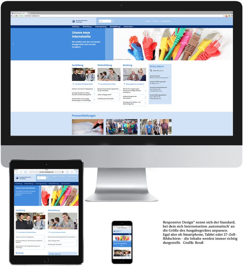 „Responsive Design“ nennt sich der Standard, bei dem sich Internetseiten ‚automatisch’ an die Größe des Ausgabegerätes anpassen. Egal also ob Smartphone, Tablet oder 27-Zoll-Bildschirm – die Inhalte werden immer richtig dargestellt.