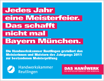 "Die Jungmeisterinnen und Jungmeister haben mit dem erfolgreichen Abschluss einer anspruchsvollen Weiterbildung im besten Sinne Unternehmergeist bewiesen“, sagte Kammerpräsident Joachim Möhrle. „Sie haben Durchsetzungsvermögen und Leistungswillen gezeigt, um ein hoch gestecktes Ziel zu erreichen. Sie können mit Recht stolz auf sich sein. Die Handwerkskammer Reutlingen ist es mit ihnen.“