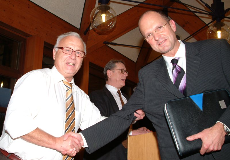 Hauptgeschäftsführer Roland Haaß (links) gratuliert nach der Wahl seinem Nachfolger Joachim Eisert (rechts). Im Hintergrund Kammerpräsident Joachim Möhrle.