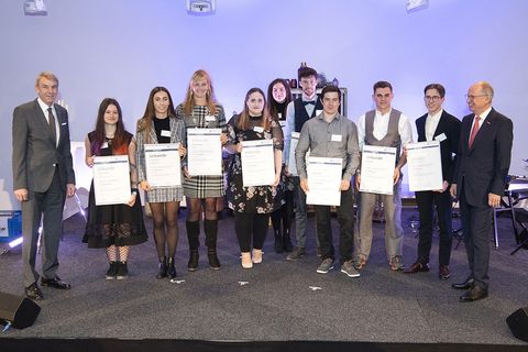 Die besten Nachwuchshandwerker aus der Region bei der Feierstunde in Stuttgart. Zu den Gratulanten gehörten Landeshandwerkspräsident Rainer Reichhold (rechts) und Kammerpräsident Harald Herrmann (links). Foto: KD Busch/Handwerkskammer Region Stuttgart