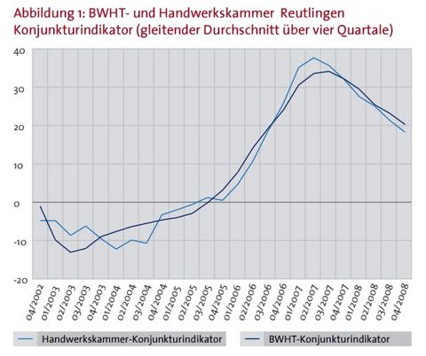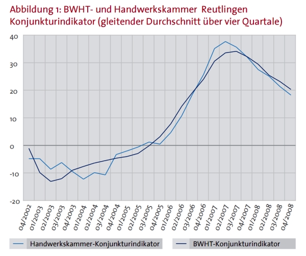 Der Konjunkturindikator der Handwerkskammer Reutlingen, der sowohl die aktuelle Geschäftslage als auch die Erwartungen der Betriebe ausweist, sank im vierten Quartal 2008 auf +9,4 Punkte. Im vorigen Quartal lag dieser Wert bei +16 Punkten, im Vorjahr noch bei +21,7 Punkten.