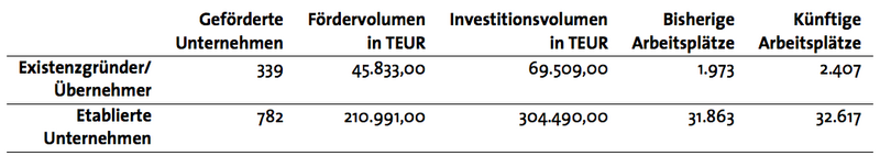 Unter den geförderten Unternehmen sind 339 Existenzgründer. Sie erhielten Darlehen über rund 46 Millionen Euro. An 782 etablierte mittelständische Unternehmen wurden Fördermittel in Höhe von rund 211 Millionen Euro ausgezahlt.