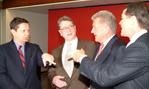 Dr. Frank Schirrmacher, Festredner beim Neujahrsempfang von Handwerkskammer und IHK mit Joachim Möhrle, Präsident der Handwerkskammer Reutlingen, Wirtschaftsminister Ernst Pfister und Eberhard Reiff, Präsident der IHK (v.l.n.r.).